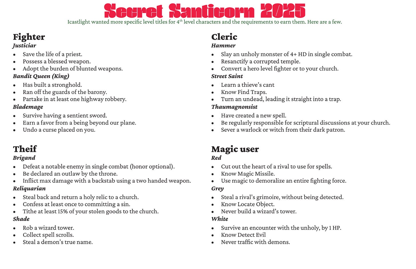 My ask was for: Specific level titles for 4th level, and the requirements to earn them. I think you’ll agree my Secret Santicorn delivered!