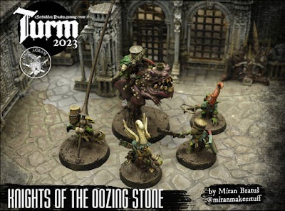 In 28-Mag, there were a couple of play reports about “Turm2023” which was a narrative skirmish tournament run by Anna from Gardens of Hecate. Like Mordheim it featured a ruined city, kitbashed miniatures, but the ruleset was Forbidden Psalms, a wargame based on Mork Borg. The ruleset was chosen for its simplicity: make a warband of 5 models, try to get 12+ on a d20 to do anything, and each model has four stats modified by picking one of 2 stat lines. Weapons and HP interact much like D&D.